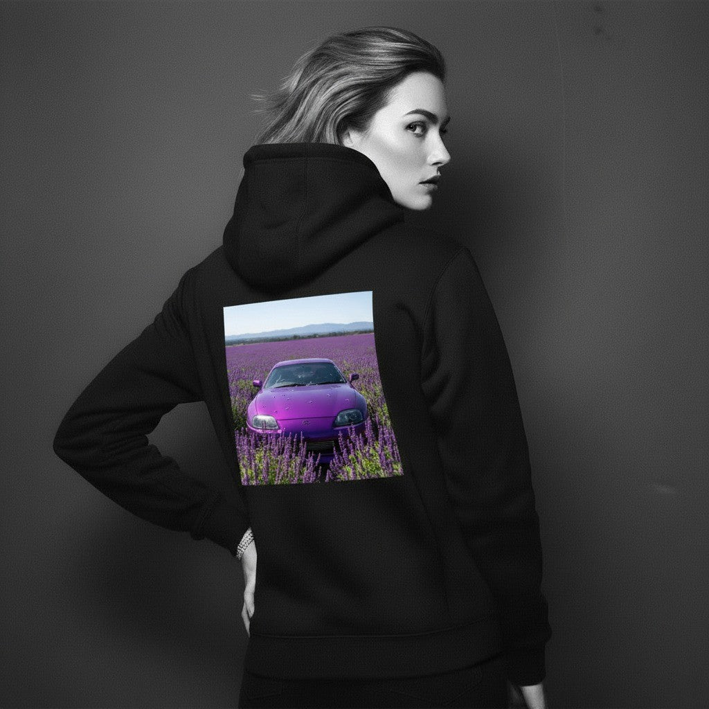 A cinematic, high-definition photo of a purple Toyota Supra MK4 parked in the middle of a vast field of blooming purple salvia flowers under a clear sky. The car is centered in the frame, its glossy paint reflecting sunlight, with small petals scattered across the hood. The endless field of salvias blends seamlessly with the Supra’s color, creating a striking and immersive scene. Designed as a bold back graphic, paired with a clean Weissach Werks crest at the heart/chest placement on the front.